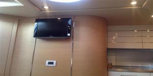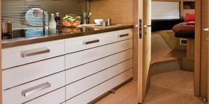 Кормовая платформа C46 широка и удобна для купания, тем более, что нет необходимости хранить здесь тендер: он убирается в гараж с электроприводной дверью, размещенный под лежаком для загара. В самой платформе спрятаны два люка, где удобно хранить кранцы, спасжилеты и спасательный плот. Еще один рундук находится в полу кокпита, а рядом — люк в машинное отделение. В отделке кокпита преобладает тик — из него сделан стол с поворотной ножкой, позволяющей увеличивать его вдвое, а также бар, оснащенный всевозможной бытовой техникой, что вполне заслуживает названия мини-кухни. Здесь есть плита, холодильник с верхней загрузкой (его деревянная крышка служит разделочной доской), еще один холодильник внизу и льдогенератор. Разумеется, есть и раковина с холодной и горячей водой, встроенная в столешницу матового стекла. Обеденная зона конвертируется в еще один лежак для загара. В кокпите огромная площадь хард-топа позволяет открыть добрую половину верхней палубы. Есть еще и диван-шезлонг — если откинуть спинку, под ней обнаруживается плоский LCD-телевизор.