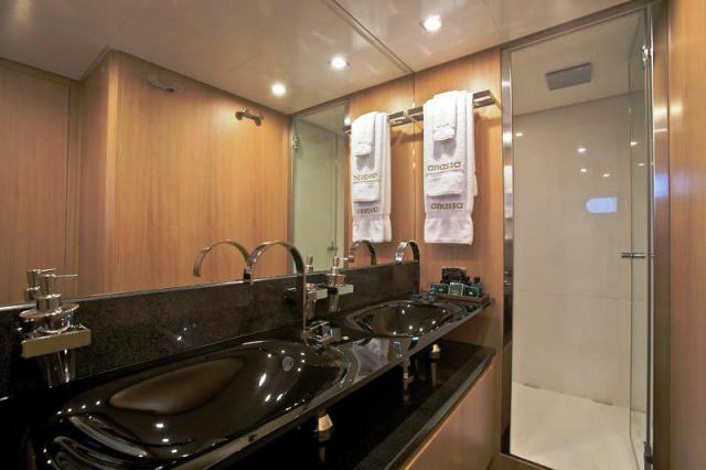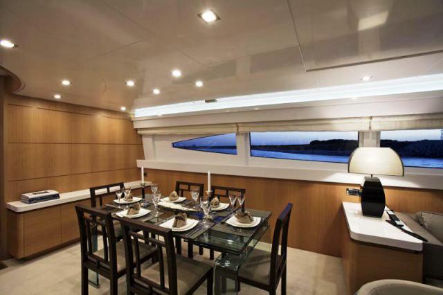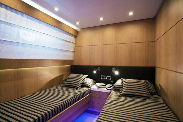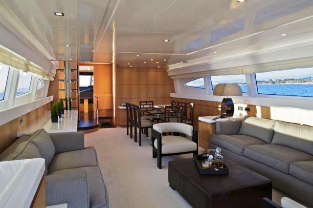 Палуба яхты CANADOS 86, оборудованная специальными местами для развлечений, станет замечательным местом для отдыха. Интерьер моторной яхты CANADOS 86 выполнен в современном лаконичном дизайне. Изысканные линии и необычные цветовые решения придают интерьеру особую неповторимость. Большой салон разделен на зону отдыха, с белыми кожаными диванами, баром и мультимедийной системой (плазменный телевизор, декодер, система Bose Sky) и обеденную зону. На нижней палубе расположена зона отдыха, разделенная на 4 каюты, включая мастер-каюту, которая занимает всю ширину корпуса и две каюты с двумя отдельными кроватями. Все каюты имеют отдельные санузлы. В мастер-каюте туалетный столик, диван, шкаф, ванная комната с отдельной душевой кабиной. Каждая каюта имеет свой собственный телевизор и декодер Sky. На главной палубе есть большая площадка для принятия солнечных ванн. А на широком столе на флайбридже можно с комфортом обедать и готовить барбекю на открытом воздухе.